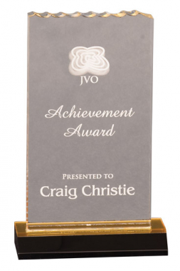 4 1/2" x 8" Ice Top Acrylic award features 3/4" thick clear Acrylic mounted on Black Acrylic Base with Gold Mirror. The gold mirrored base reflects a gold tint to the award.